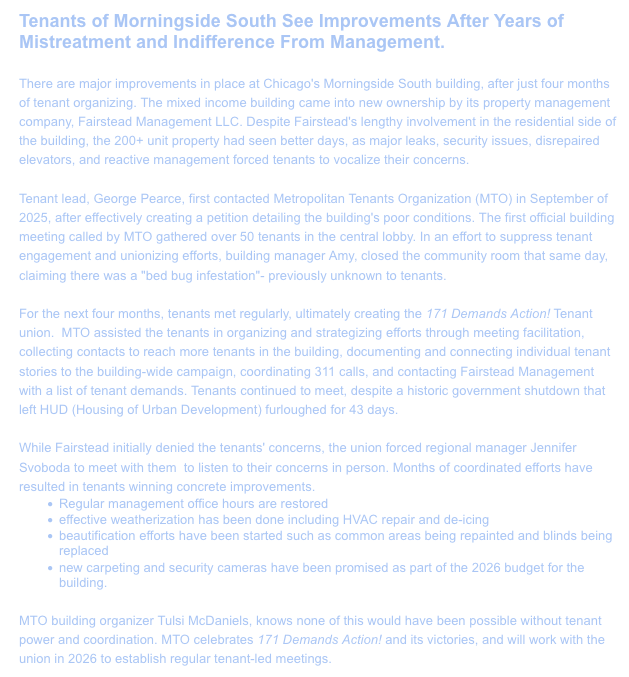 We are happy for our allies at the Metropolitan Tenants organization for continuing their efforts to help tenants realize their collective power. And congratulation to the tenants for organizing a tenant union and raising concerns about the poor conditions. Tenant organizing isn't always easy but this is proof that it can achieve positive results.